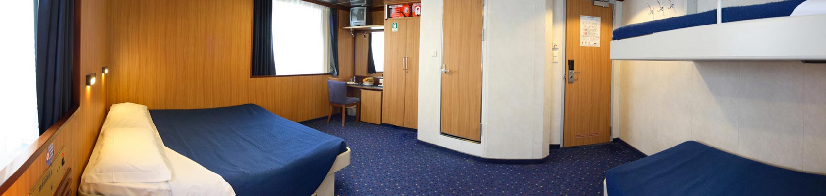 Interior Suite for 4 without porthole Upper deck Suite for 4 with twin beds and double bed, en suite bathroom with shower, hairdryer and cable radio, without porthole. (S4)